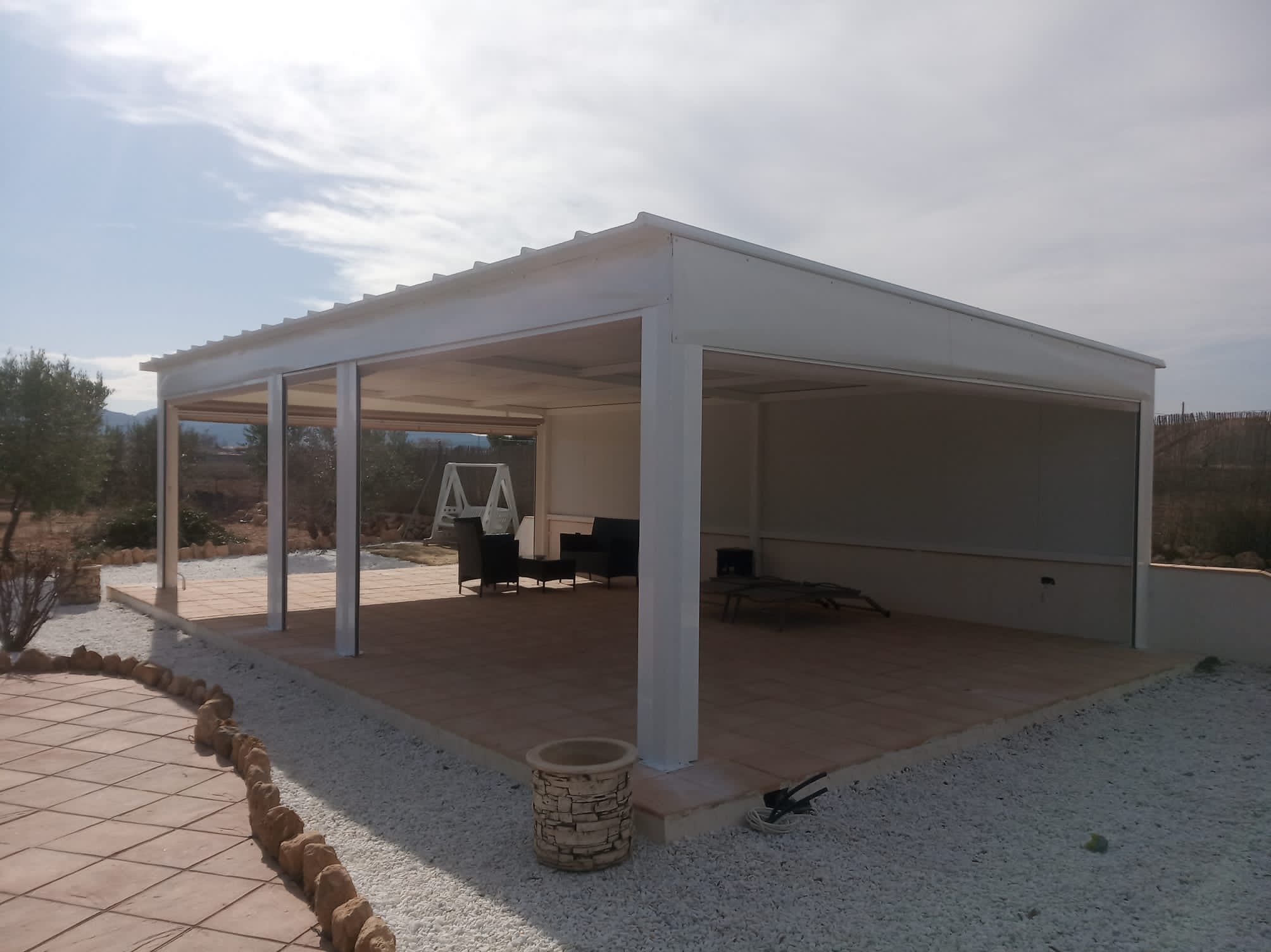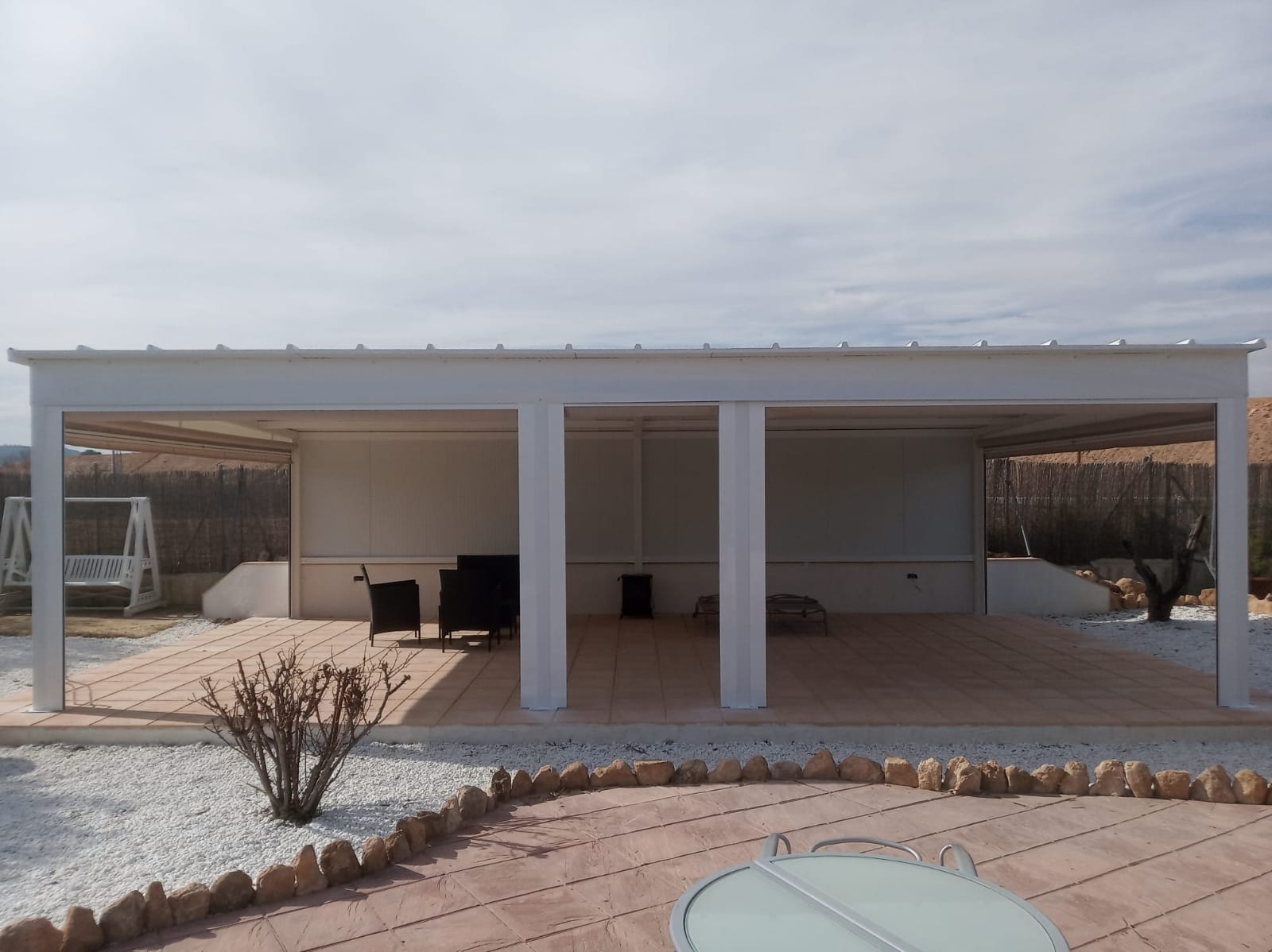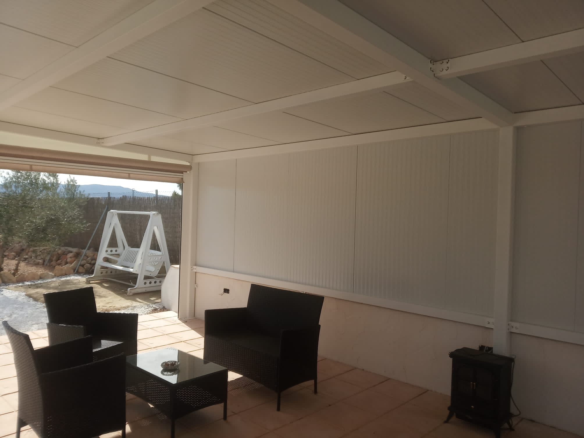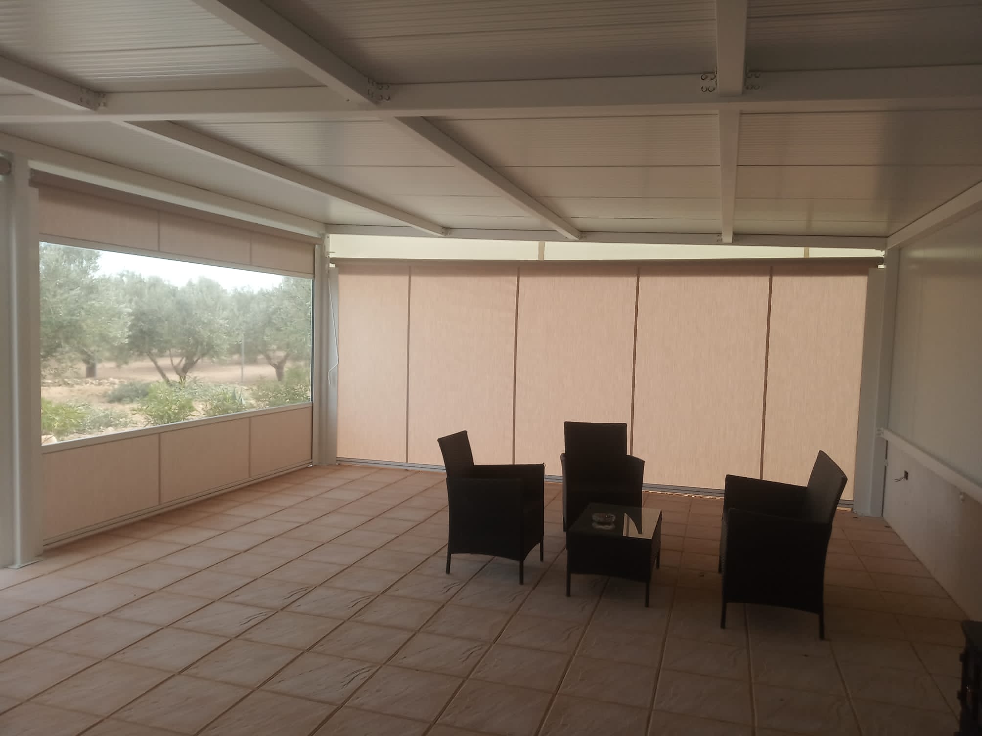 Estructura de Hierro Lacado al Horno, Techo Fijo Panel Sándwich y Toldos Verticales con Guías Cortavientos y Ventana Panorámica.
