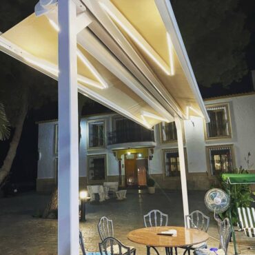 Estructura de Hierro lacado al horno con Toldos Cofre de brazos extensibles, además le añadimos luces LED, proporcionando una luminosidad y ambiente perfecto.