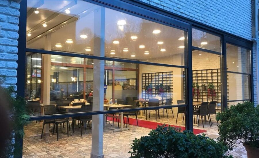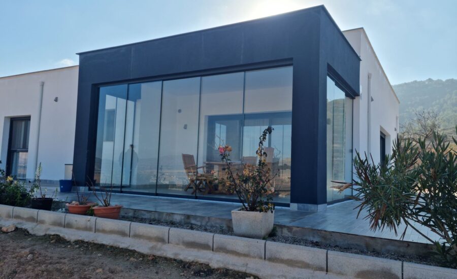 Sistema vertiflex Cerramiento móvil (acristalado de accionamiento motorizado).Cuando es plegado queda formando una barandilla de cristal delimitando la estancia.