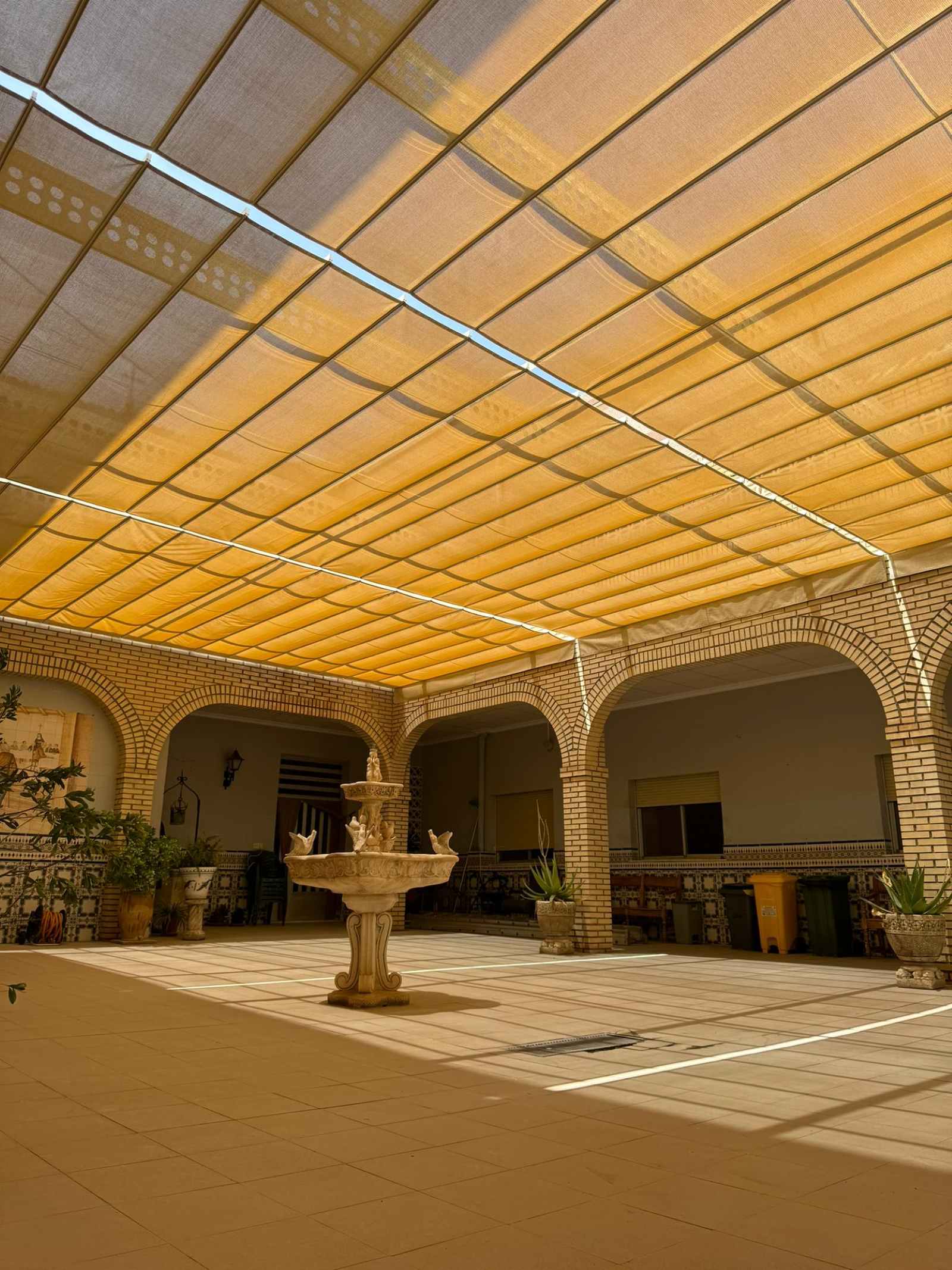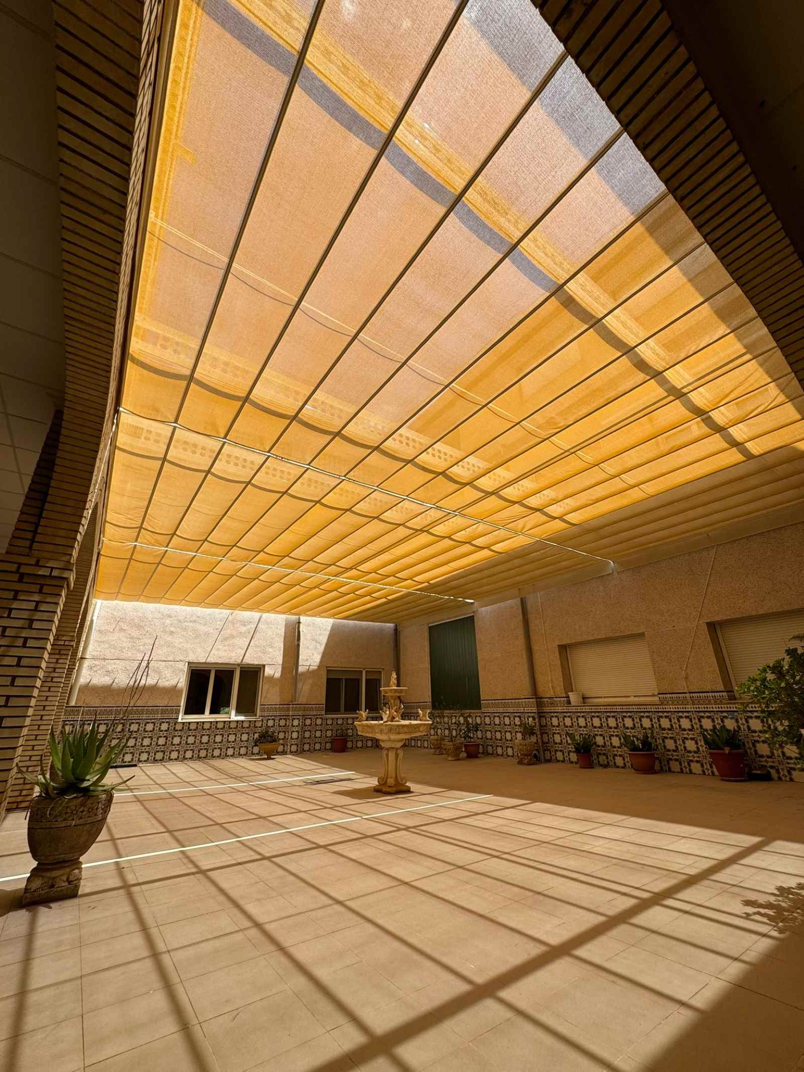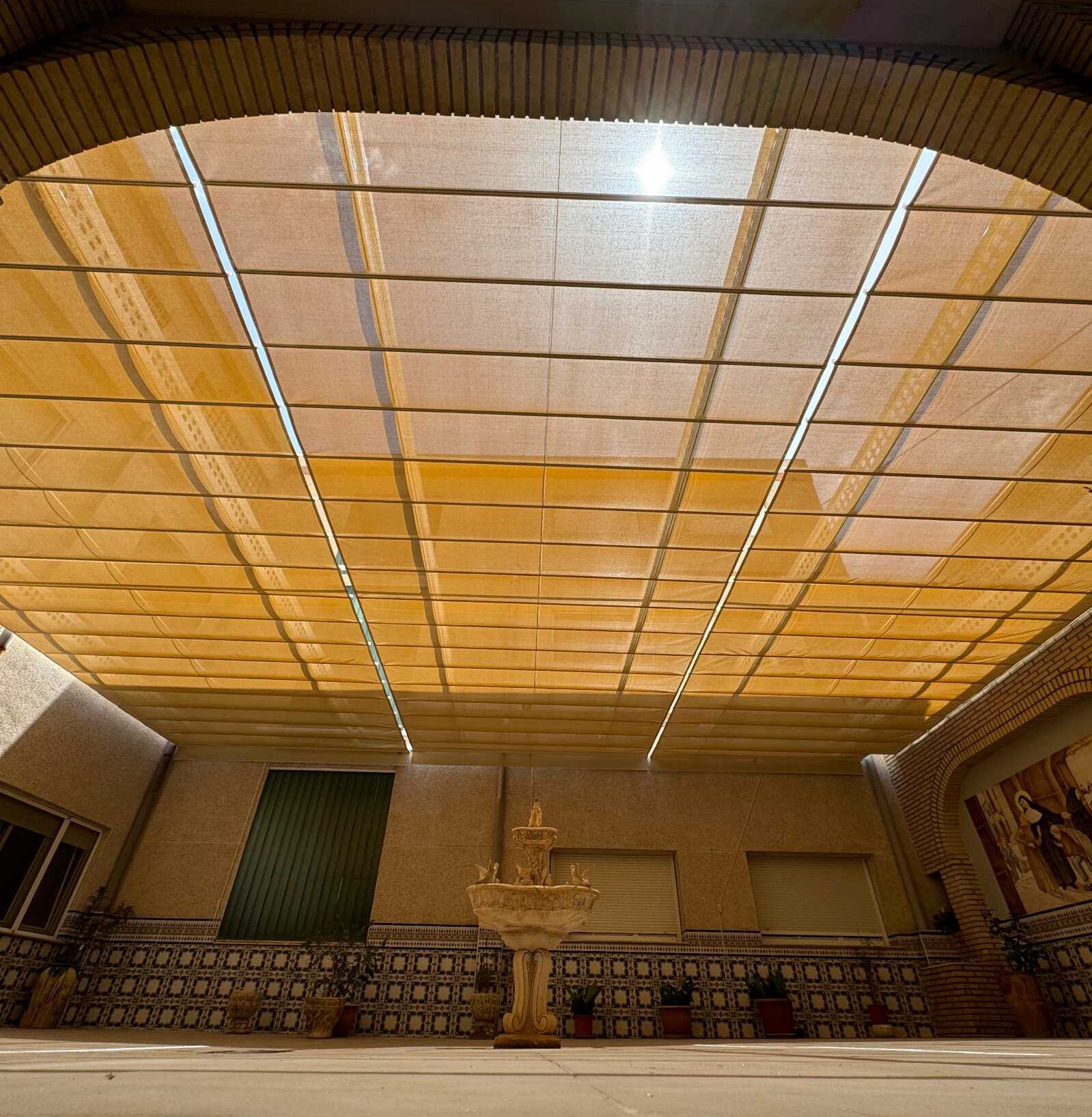 Este toldo es ideal para cubrir grandes superficies sin la necesidad de tener pilares intermedios. Está confeccionado en tejido técnico microperforado, lo que hace que se pueda ver a través de él y crea un espacio cálido y único. Se puede accionar de manera manual o automático.