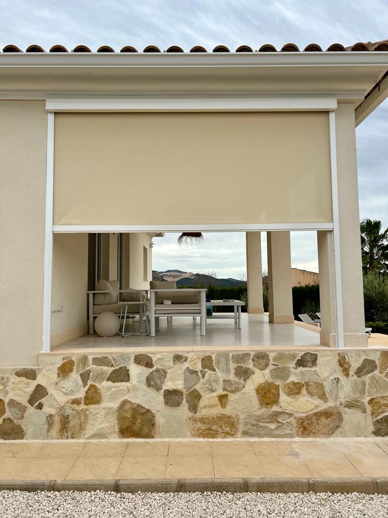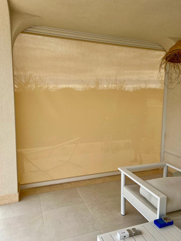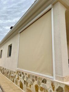 Toldo vertical con Cofre, con guía de cremallera, evitando así que la tela se salga de la guía, incluso con viento, confeccionado en tejido especial microperforado tipo screen.